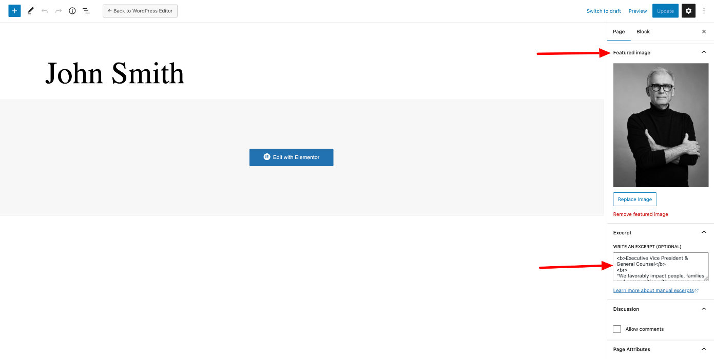 Firstly, click "Edit with Elementor" and scroll to the section. You can customize the "Meet our leadership" section in two directions. You can customize the heading and the button. You'll notice that the Posts widget is global; a global widget gives you full control over a specific widget displayed in multiple places on your site. Editing it in one place will instantly update the rest. It saves you the time and effort of going through the many pages on your site and updating the content manually, one by one.